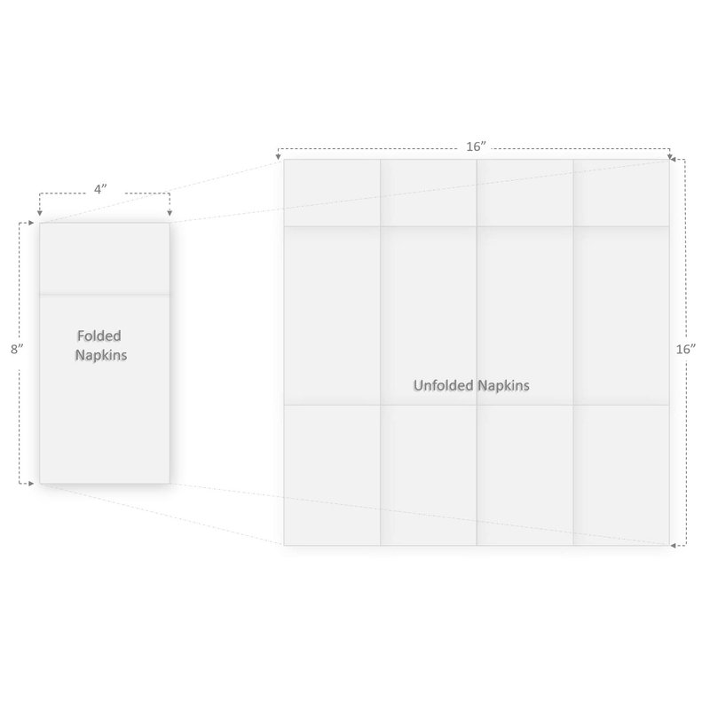 - Dinner Size, 16'' x 16'' Unfolded, comes Pre-folded for Silverware (silverware not included) Size Prefolded 8" x 4"