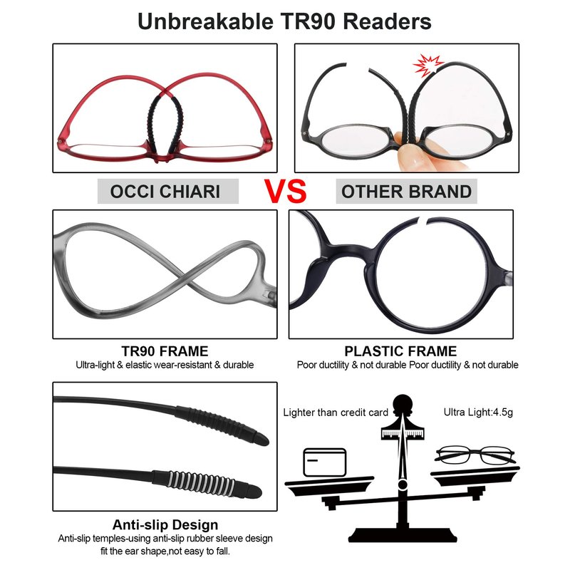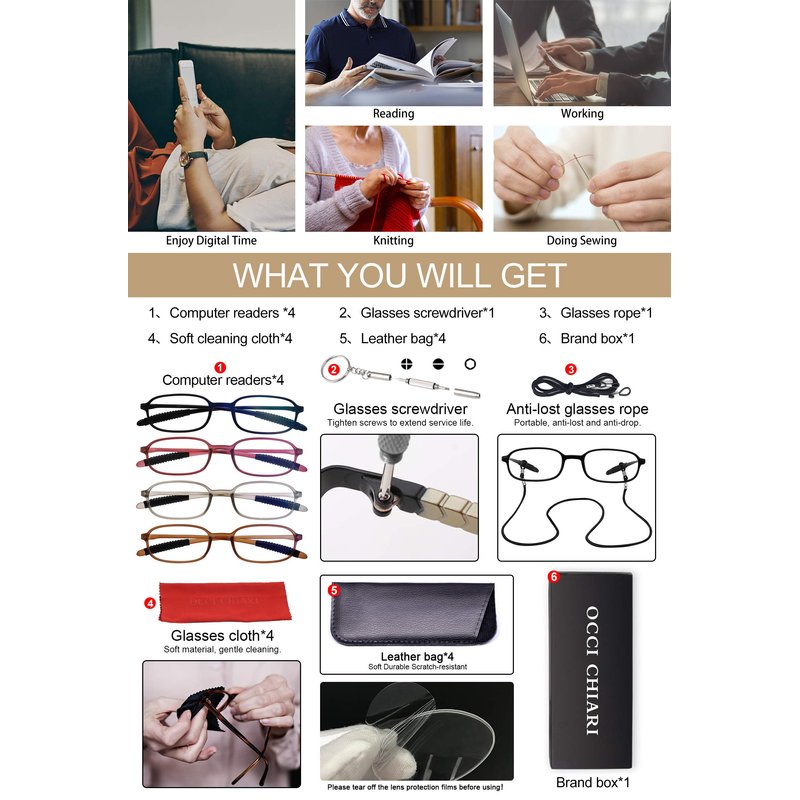 - Great Value - 4*Reading glasses, 4*Leather Pouch(worth $3), 1*Glasses rope(worth $2), 1*Glasses screwdriver(worth $2), 1*Glasses cloth(worth $1), 1*Brand box as a beautiful gift. 100% replacement or refund service, if any damage occurs to the readers +1.75, please contact OCCI CHIARI service team to solve the problem quickly and effectively.