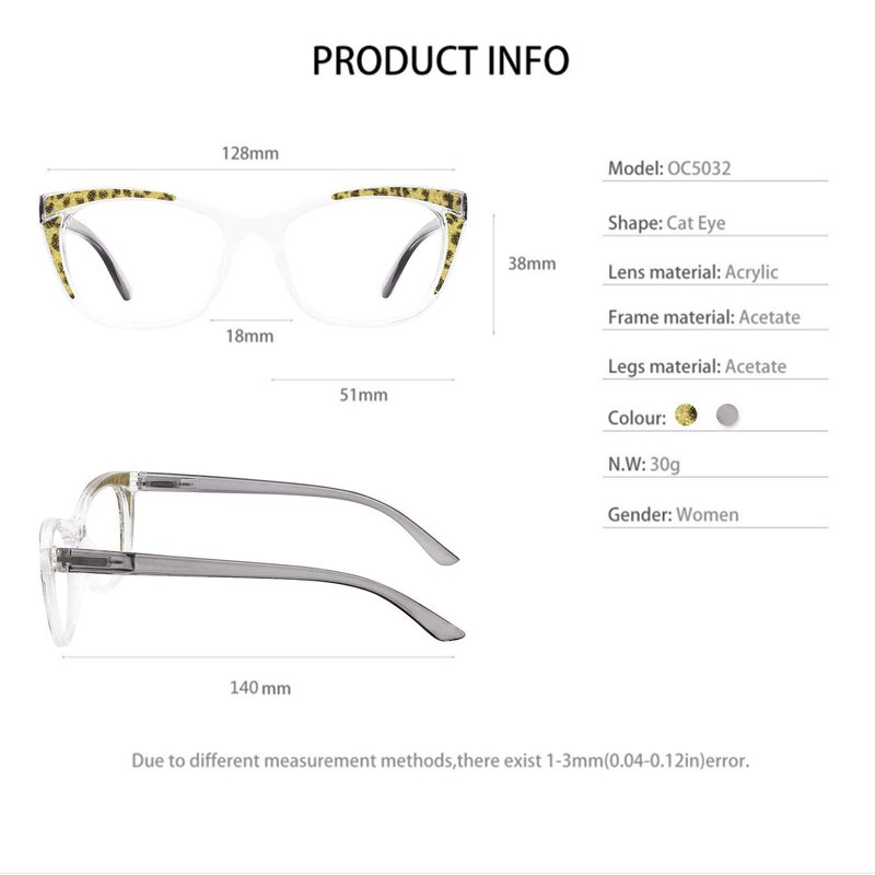 - SIZE & PACKING: Lens width:51mm(2IN), Bridge:18mm(0.71IN), Arm:140mm(5.51IN), Frame width:128mm(5.04IN). Package Included:1*womens readers 1.50, 1*glasses cleaning cloth, 1*black glasses bag (to protect the lens and more convenient to carry), 1*Black original packaging box as a beautiful gift for female.