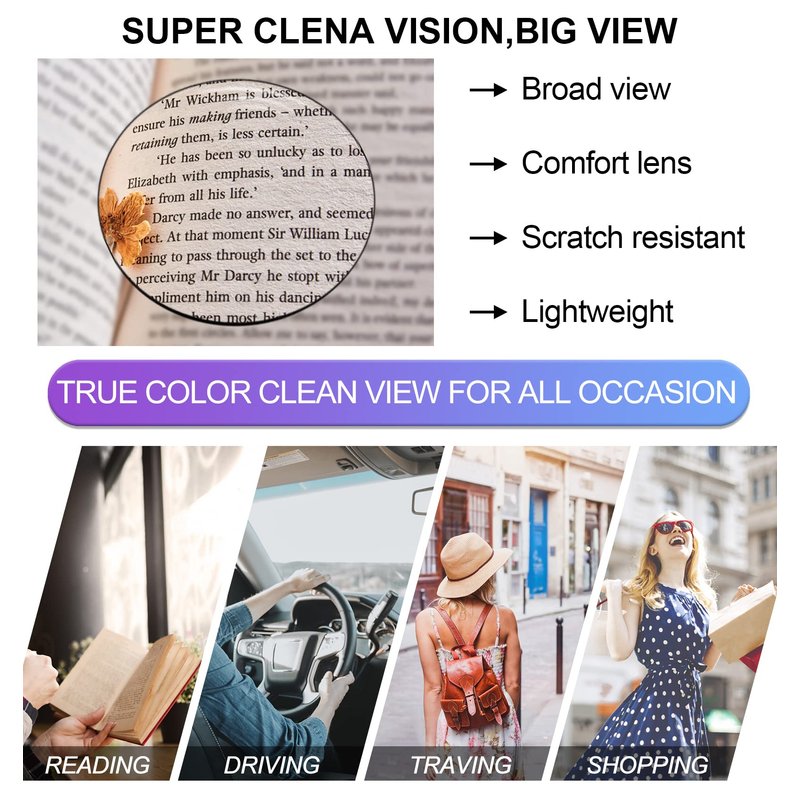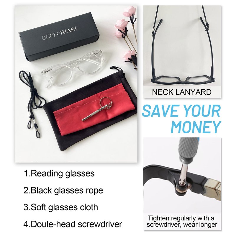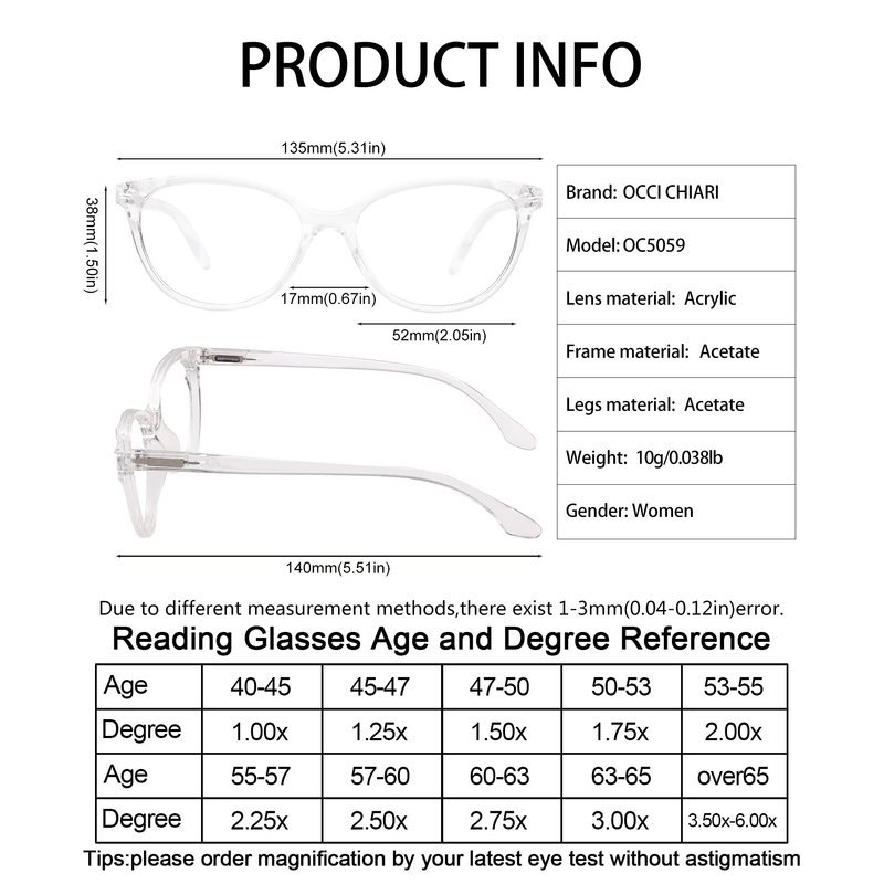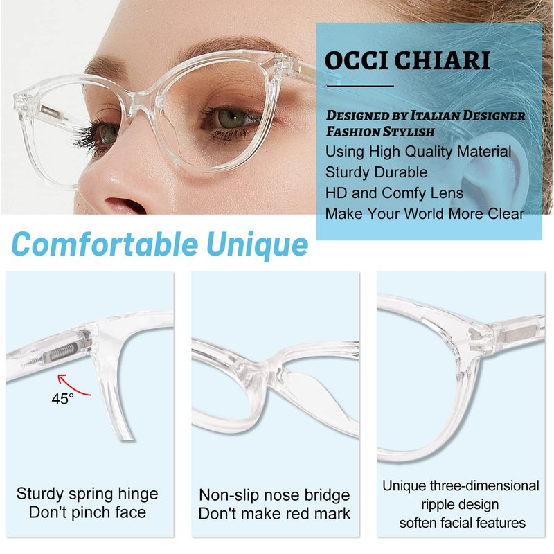 - Crystal-Clear Vision: OCCI CHIARI's premium acrylic lenses ensure a clear view. With A-class clarity and high precision, these women's readers sharpen your vision for effortless small print reading and daily tasks, presenting you with a large and sharp visual field.
