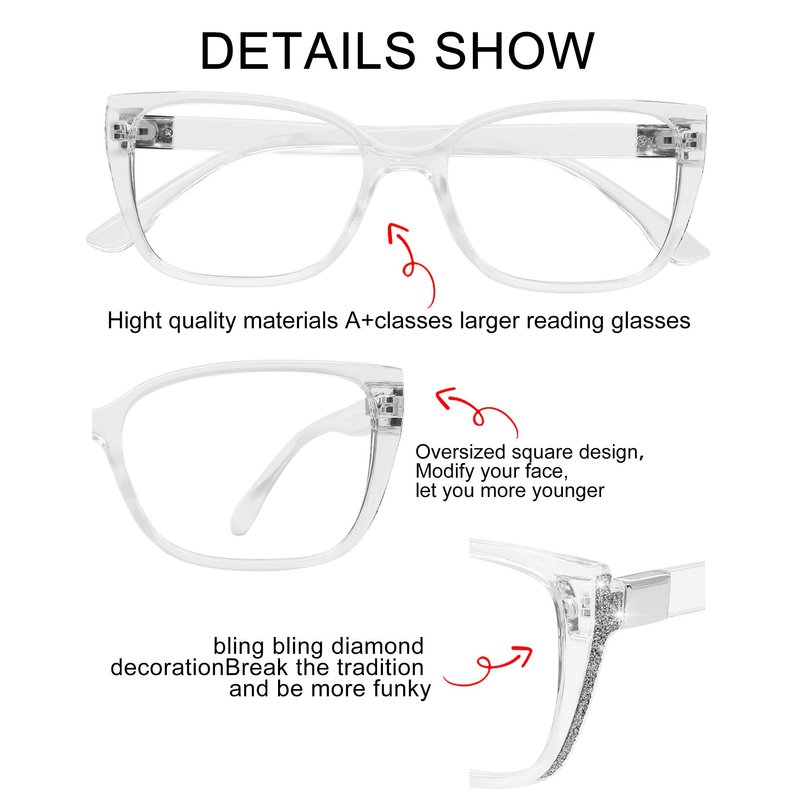 - Wear for long time:one-piece nose pad,don't easy make red mark with good wearing experience.the diamond decoration give a expensive feeling, make you more young,The nose pad fit the bridge of the nose,preventing glasses from slipping and imprinting the skin