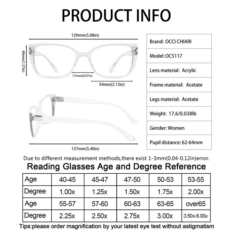 - Crystal Clear Lens :OCCI CHIARI reading glasses has optical,strong,durable frame and clear acrylic , square lenses.The acrylic lenses are clear enough. This sturdy reading glasses have A-class clear lenses which have higher precision as well ,makes the vision clear,give you a very big and sharp view,weren't so reflective and scratch resistant lens