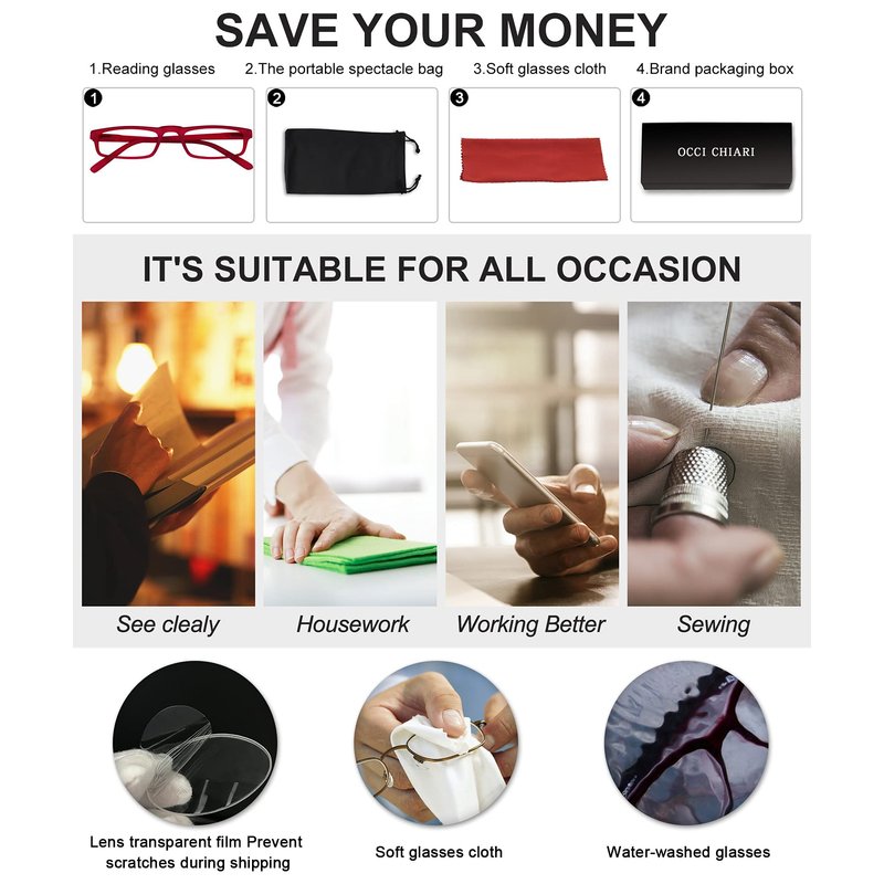 - Make your world clear :This glasses is very fashionable,modern design wearing these reading glasses are suitable for anywhere,no matter when you at home, in bed, at the office, means you'll always look sharp, and see sharper! Reading glasses can help you see nearby things more convenient.For example, when you read a book, do needlework, or use a mobile phone, you can wear reading glasses to make your line of sight clearer.Also,The lenses can be replaced with a prescription lenses.