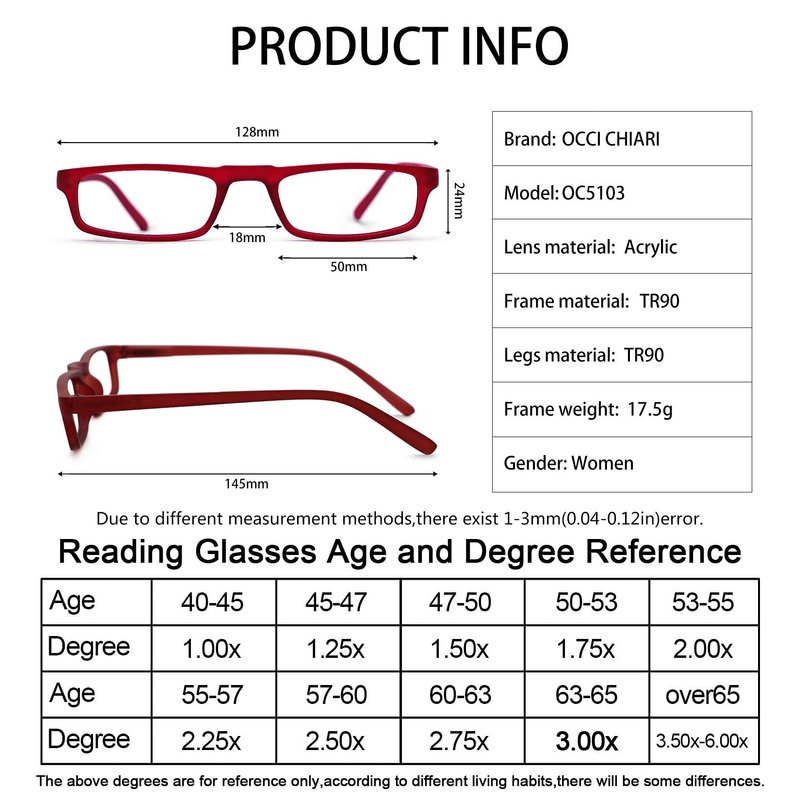 - Reading glasses Measurement and causion: Lens width:50mm(1.97’’), Bridge:18mm(0.71’’), Arm:145mm(5.71’’), Frame width:128mm(5.04’’), Frame height:45mm(1.77’’),there are 1.0x(40 to 45 years old) 1.25x(45-47) 1.5x(47-50) 1.75x(50-53) 2.0x(53-55) 2.25x(55-57) 2.5x(57-60)2.75x(60-63) 3.0x(63-65) 3.5x(65-70) 4.0x- 6.0x(above 65year old) for your choice,for reference only.If you look at something blurred,please tear this film off (which protect lens against scratch during shipping) Fit for Women.