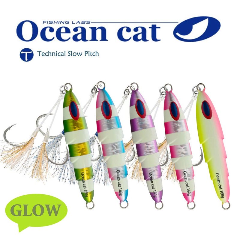 - DESIGN: OCEAN CAT lead metal flat slow fall pitch fishing jigs Lures have jagged body with attractive bright colors ,ideal for reflecting light and attracting fish from a significant distance.Glow in the dark,which can be more attractive to target fish.The front and back of jigs are asymmetric, it will present a multiple actions under water.