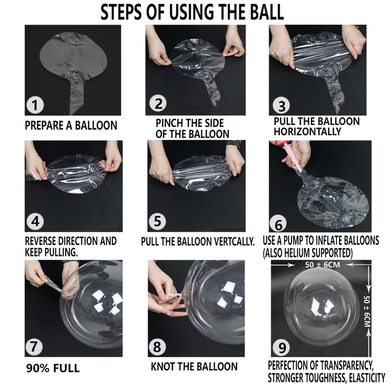 ②Balloons are made from natural rubber latex, which may cause allergic reactions to skin. So it is recommended to inflate balloons with balloon pump, not mouth.