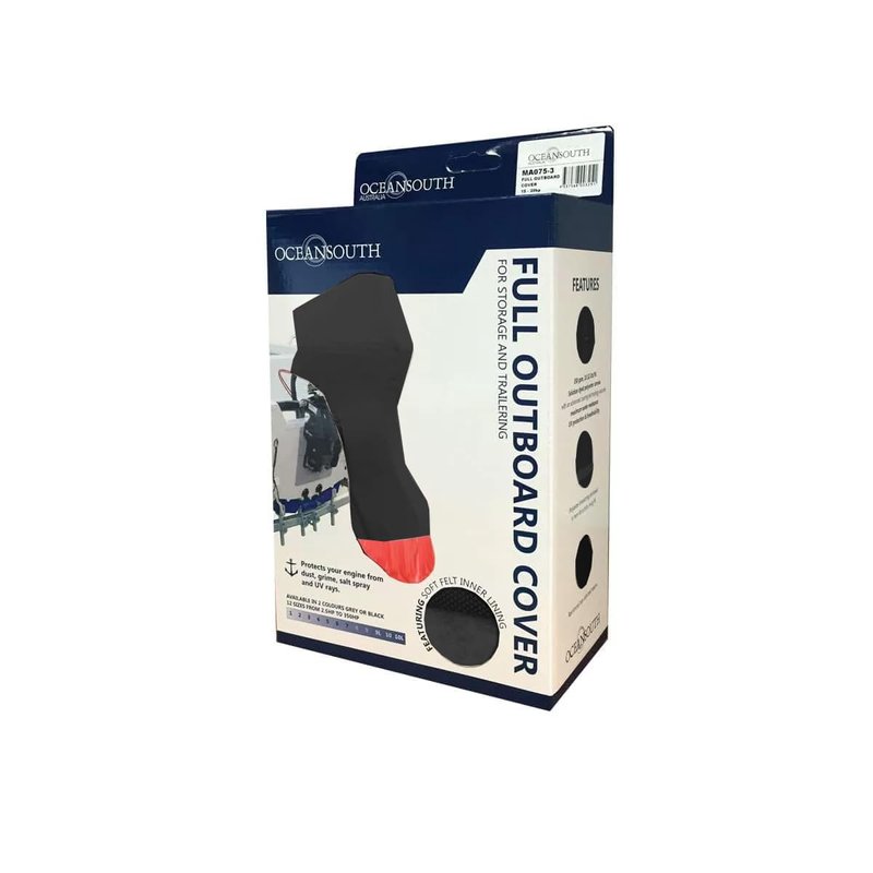 The Oceansouth Universal Full Outboard Cover is a heavy-duty solution crafted to offer complete protection for your engine cowling against dust, grime, and the damaging effects of UV rays. This versatile cover accommodates both 2-stroke and 4-stroke engines, ranging from 2.5hp up to 350hp, ensuring thorough protection during trailering or storage. Crafted from UV-resistant polyester fabric with water-repellent properties, this cover safeguards your outboard engine from the elements. With reinforced top-stitched seams and a zip-up leg section complemented by a drawstring, this cover provides a secure and snug fit, offering optimal protection against water, sun, and grime during transportation or while your boat is in storage. Made from ATLAS premium woven dope-dyed polyester fabric, this Universal Full Outboard Cover is built for durability and longevity, making it an essential accessory for safeguarding your valuable outboard motor.