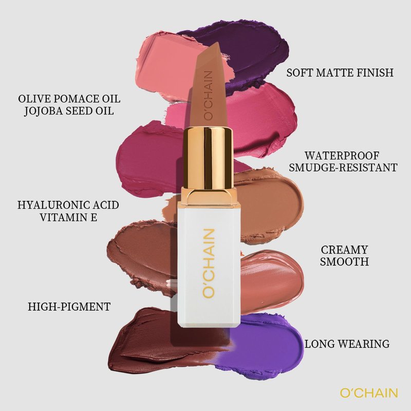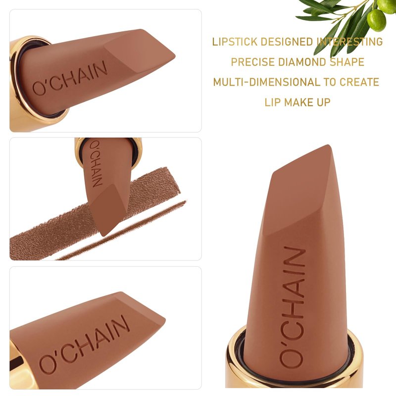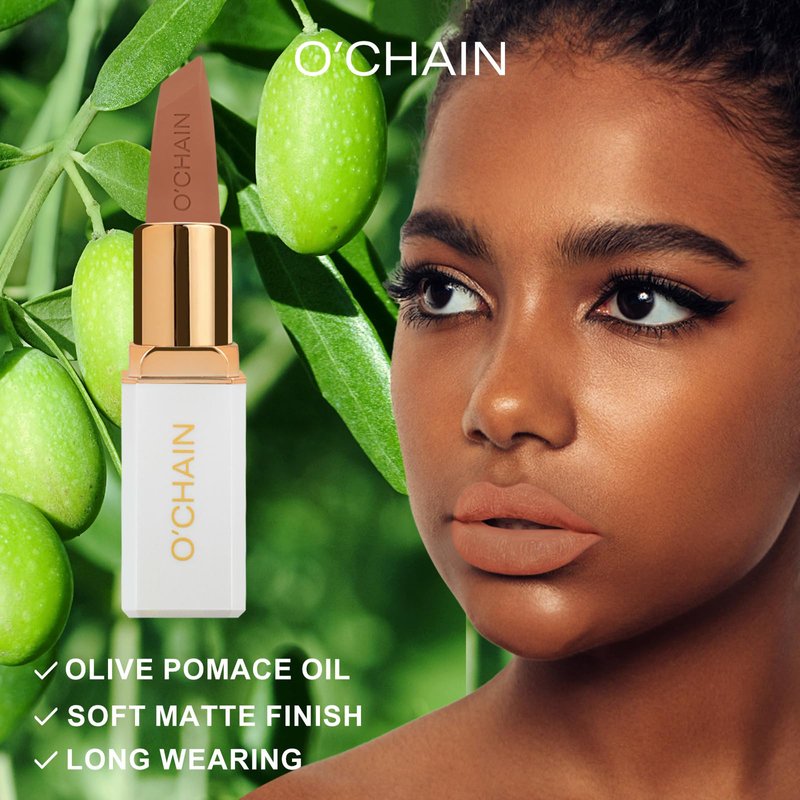 - Matte Lipstick Formula: O'CHAIN nude lipstick is enriched with refined olive oil, jojoba oil, hyaluronic acid, and vitamin E. This combination provides nourishing, moisturizing, and antioxidant benefits, delivering a matte finish that won’t dry out your lips.