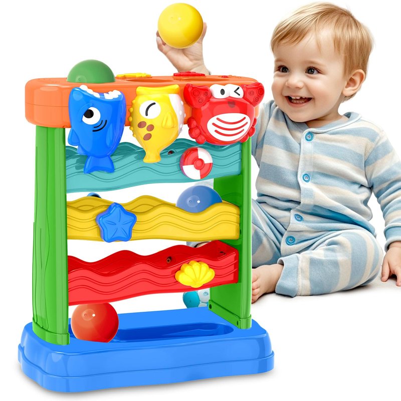 - Interactive Toys for Baby :It's an easy and exciting baby toy that allows babies to interact with a shark, pufferfish, and crab by feeding them balls into the animals' mouths. When an animal "swallows" a ball, it makes sounds to interact with the baby, such as introducing itself, or singing a song. It's easy to operate and lots of fun. This montessori toy promotes vision and hearing development and helps develop musical talents. It's very suitable for children aged 12-18-24 months and older