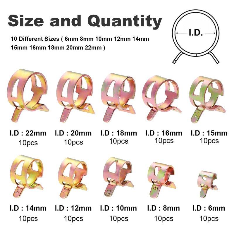 - Package includes 10different sizes spring clips:6mm,8mm,10mm,12mm,14mm,15mm,16mm,18mm,20mm,22mm,each size 10pcs.