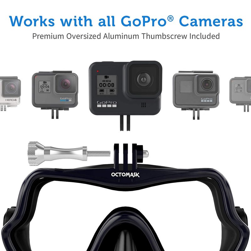 OCTOMASK's built in GoPro Camera mount offers divers a great way to shoot incredible video while diving in addition to keeping your hands free. Because let's face it, between checking dive computers or holding dive lights, you've already got your hands full. Works with ALL GoPro Models! The OCTOMASK features safety tempered lens, and a low volume design that helps keep the mask close to the face for great visibility, while the super-soft silicone helps ensure a great seal. This mask fits nearly everyone!