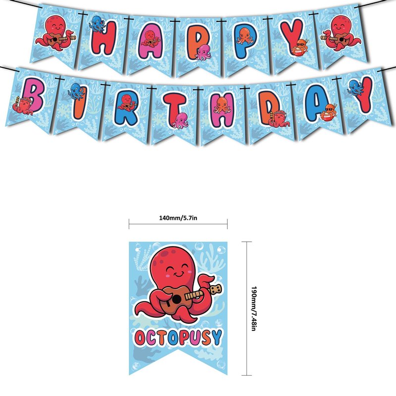 - Octopus Birthday Party Supplies Set Package includes: You will get 1 * HAPPY BIRTHDAY banner, 18 * balloon (3 styles of 6 each), 1 * cake topper, 12 * cupcake topper, each accessory has cartoon octopus elements, these party decorations will bring more fun to your party