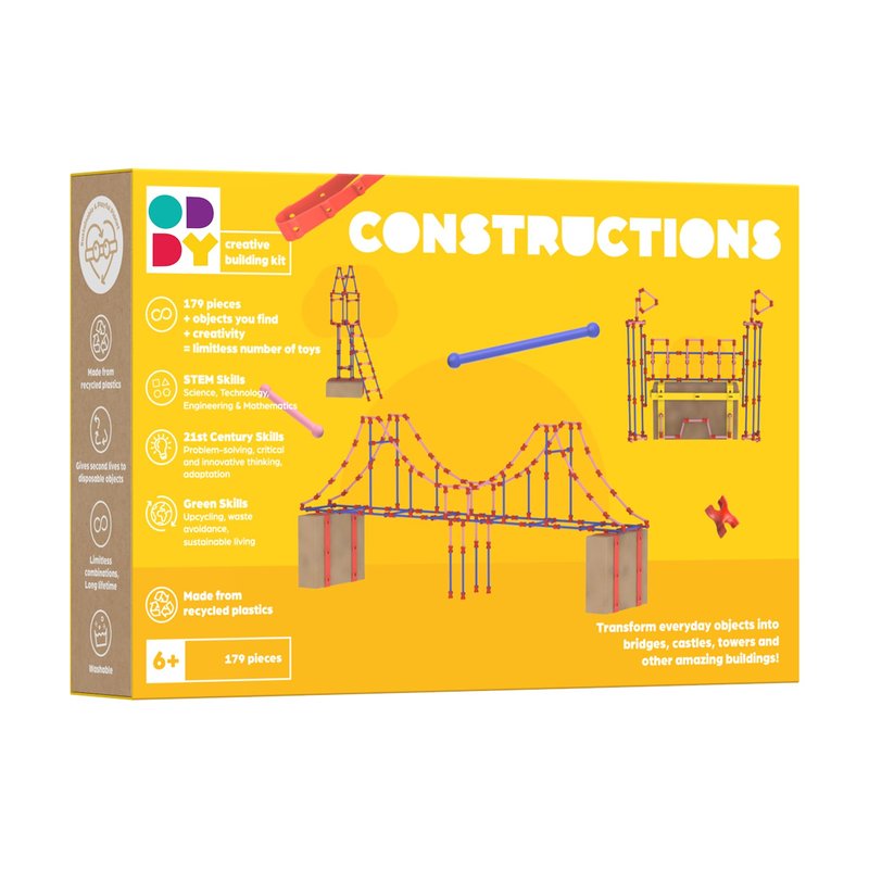 ODDY Creative Building Kits let kids transform everyday objects into toys! With this ODDY 179 Piece Construction Building Kit, kids can use common household items such as boxes, cups, and more to build creative and fun architectural marvels including ramps, bridges, castles, towers, buildings, and more! NOTE: Household items not included. Characteristics: This set includes 179 pieces that can interlock and connect, integrating with common objects to form fun and creative toy buildings and structures. Made from recycled materials, these eco-friendly toys help spark imagination and practice essential STEM (Science, Technology, Engineering, and Mathematics) and STEAM (Science, Technology, Engineering, Arts, and Mathematics) skills. Size: Packaged dimensions are approximately 11 ½ x 8 x 2 inches, making it easy to store and transport. Age: Suitable for children aged 6 years and up, the ODDY 179 Piece Construction Building Kit offers endless possibilities for imaginative play and learning. The 179 Piece Construction Building Kit is part of the ODDY Creative Building Kit collection, designed to foster creativity, learning, and eco-consciousness. By transforming everyday items into playful inventions, kids learn the value of reusing and recycling while having fun. Encourage your child's creativity and development with the ODDY 179 Piece Construction Building Kit – where the only limit is their imagination!