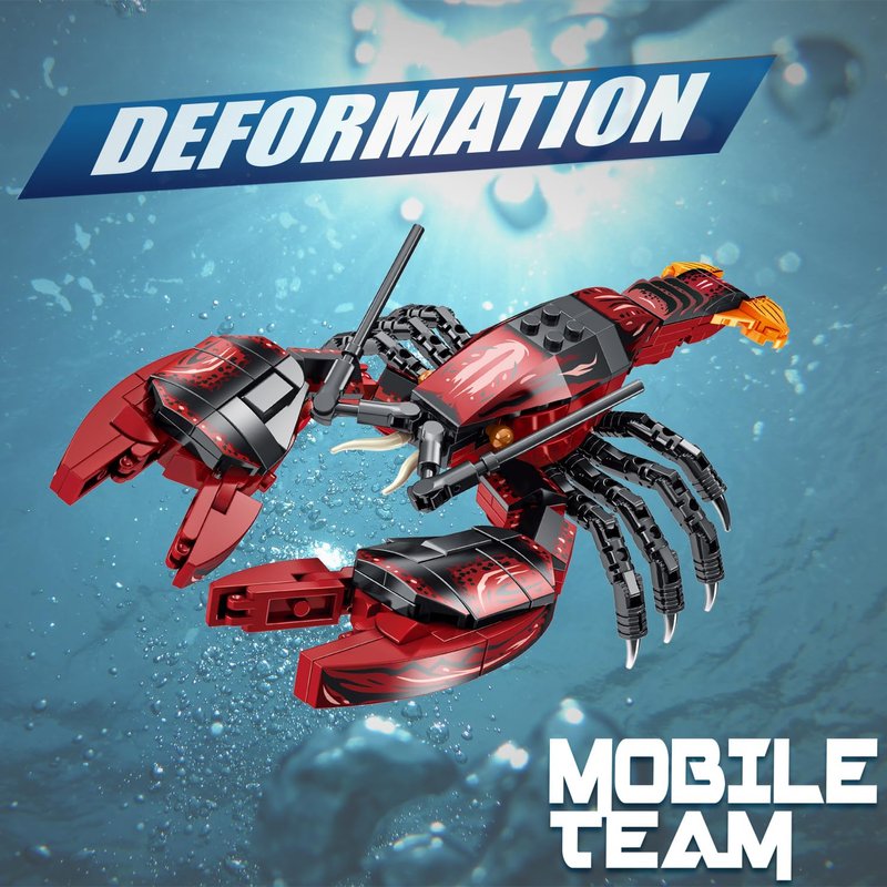 - 2 in 1 Building Toy: Lobster building toys featuring a red body, two sharp and large pincers, and eight long black feet. Kids can move its body and feet to transform it into a robot or mecha.