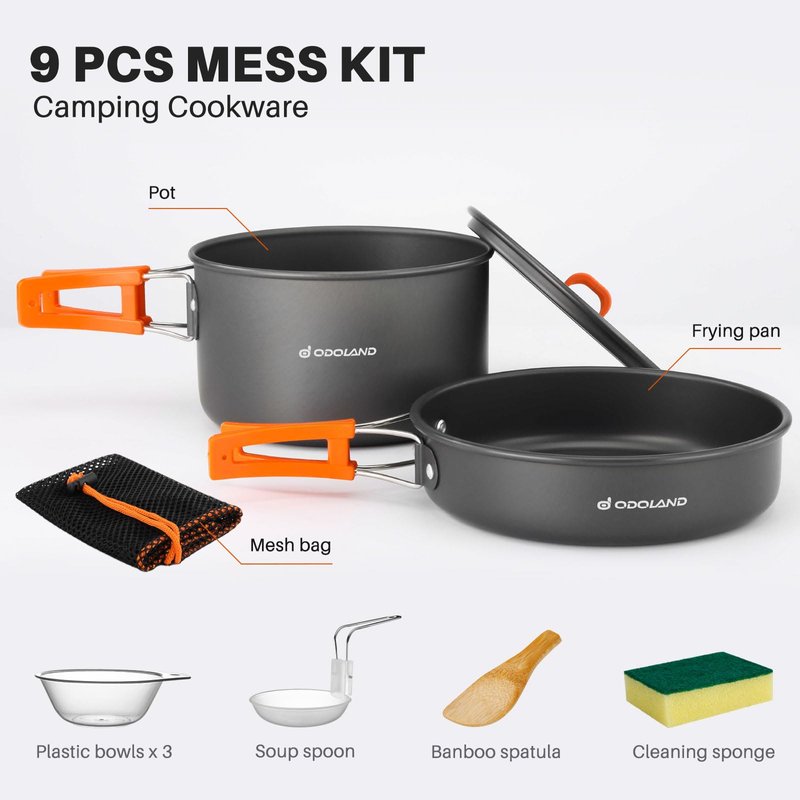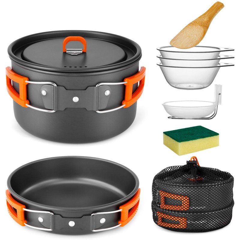 - The Best Money You Ever Spent - The 9pcs camping cookware set includes 1 x 1L pot, 1 x 0.55L fry pan, 3 x plastic bowls, 1 x soup spoon, 1 x banboo spatula, 1 x cleaning sponge and 1 x mesh bag. A great choice for hiking, backpacking, camping or any other activity.