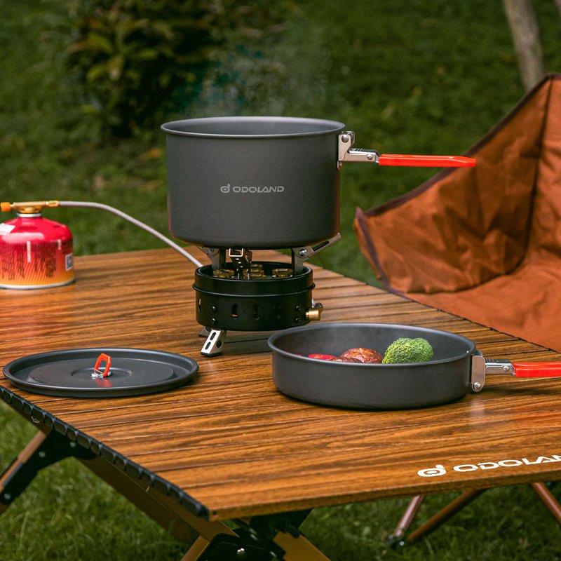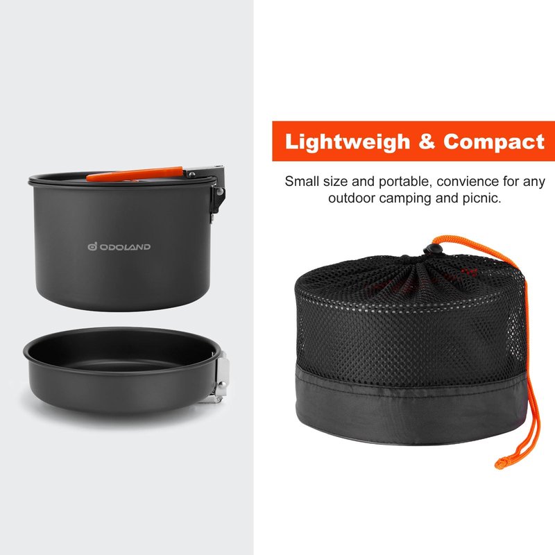- Locking Handles - The pot and fry pan feature ODOLAND's locking handle with one touch folding design. This ensures a safe and secure grip while cooking and folds away easily for stackable storage. One Kit meets all your needs! You will definitely be amazed by this professional outdoor backpacking cooking set!