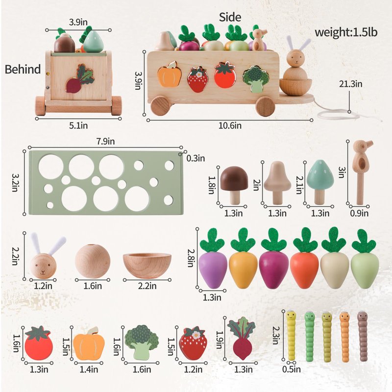 • Happy Carrot Harvest Time: Invite a friend to play with Montessori toys, choosing from a carrot and mushroom harvesting game, bug catching, shape matching, bungee cords, or a bunny stroller. Playing enhances friendship between babies and parent-child bonding. This is a perfect wooden Montessori toy for multiple players.