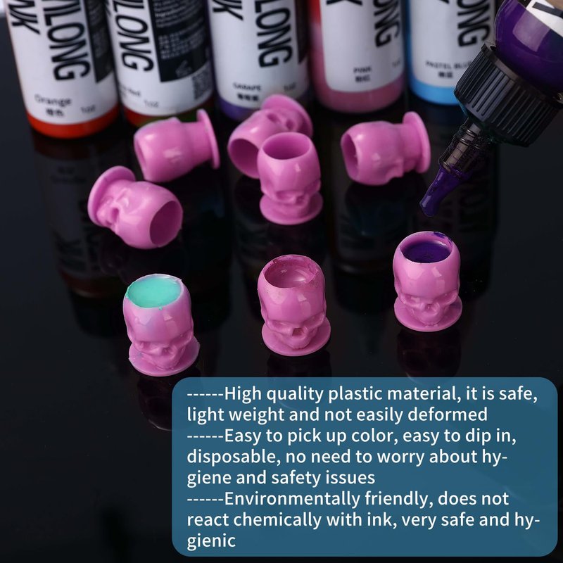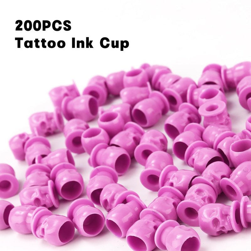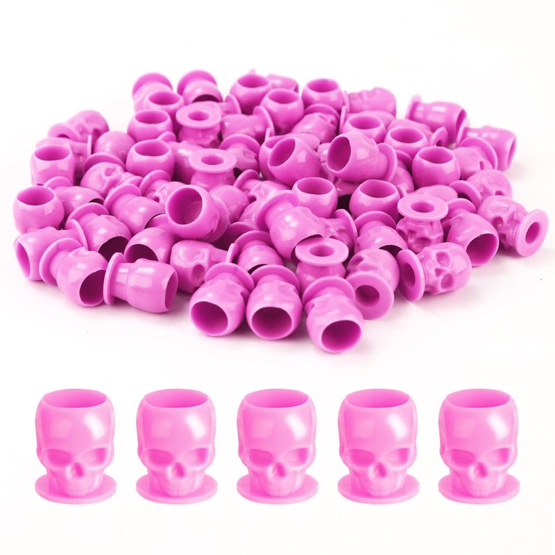 OFEYLE Tattoo Ink Caps Disposable Skull Tattoo Ink Cups 200PCS Plastic Ink Caps for Tattooing Makeup Pigment Ink Cups Tattoo Ink Holder Tattoo Supplies and Equipment, Tattoo Accessories (Pink)