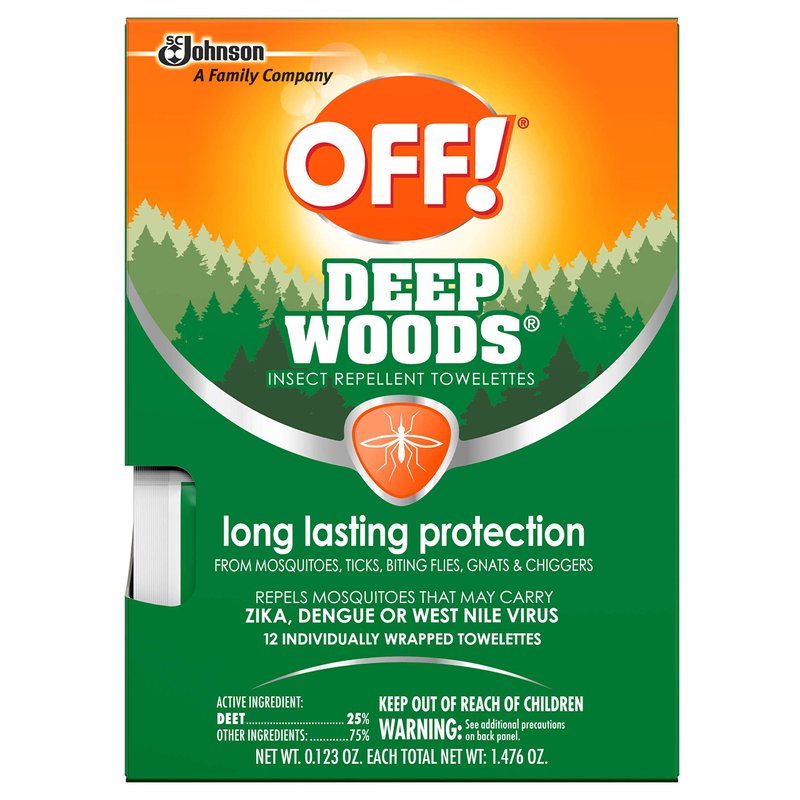 12 Individually Wrapped Towelettes. OFF! Deep Woods Insect Repellent Towelettes provide long lasting protection from mosquitoes, ticks, biting flies, gnats and chiggers. Individually wrapped towelettes, convenient to toss in your car, purse, backpack or wallet. Product label may vary.