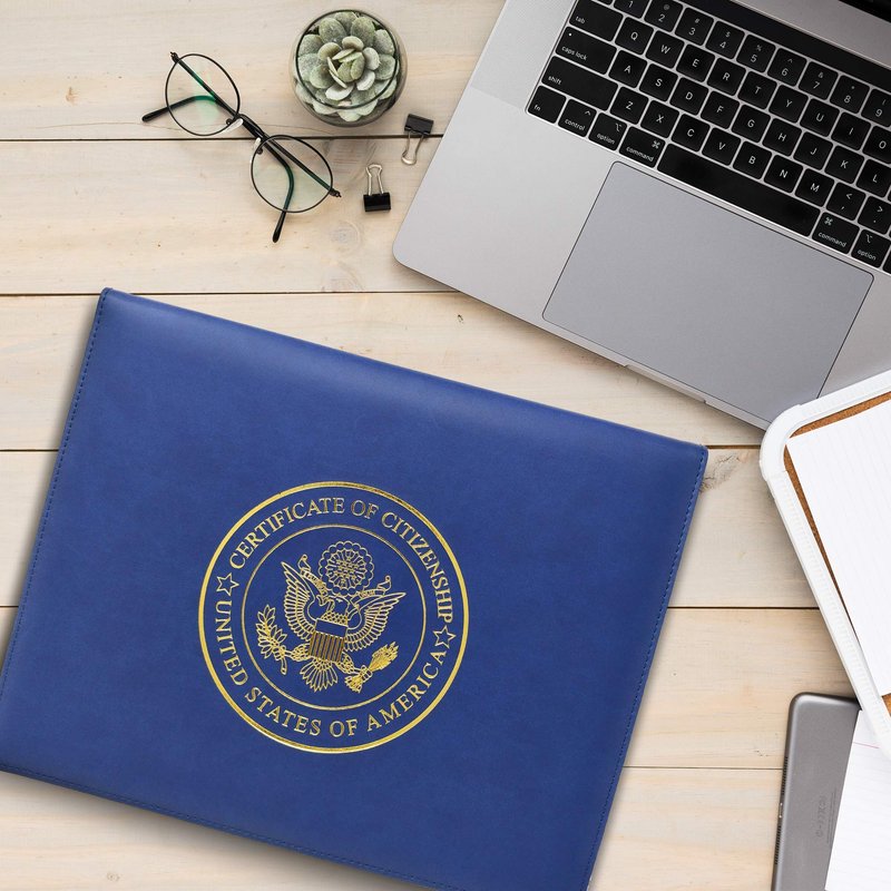 Proudly Designed in the U.S.A. by descendants of immigrants and a U.S. Navy veteran, our certificate holder embodies the essence of the American dream. Meticulously crafted with luxurious Italian vegan leatherette, it's fully padded, machine-stitched, and features the authentic Great Seal of the United States in gold leaf foil. Protect your citizenship certificate with an Official Fellow Citizen holder, a cherished keepsake. Why Choose Us? Our certificate holder is more than a cover; it's a testament to your American journey. Choose quality, heritage, and pride. Embrace Your American Dream with Official Fellow Citizen.