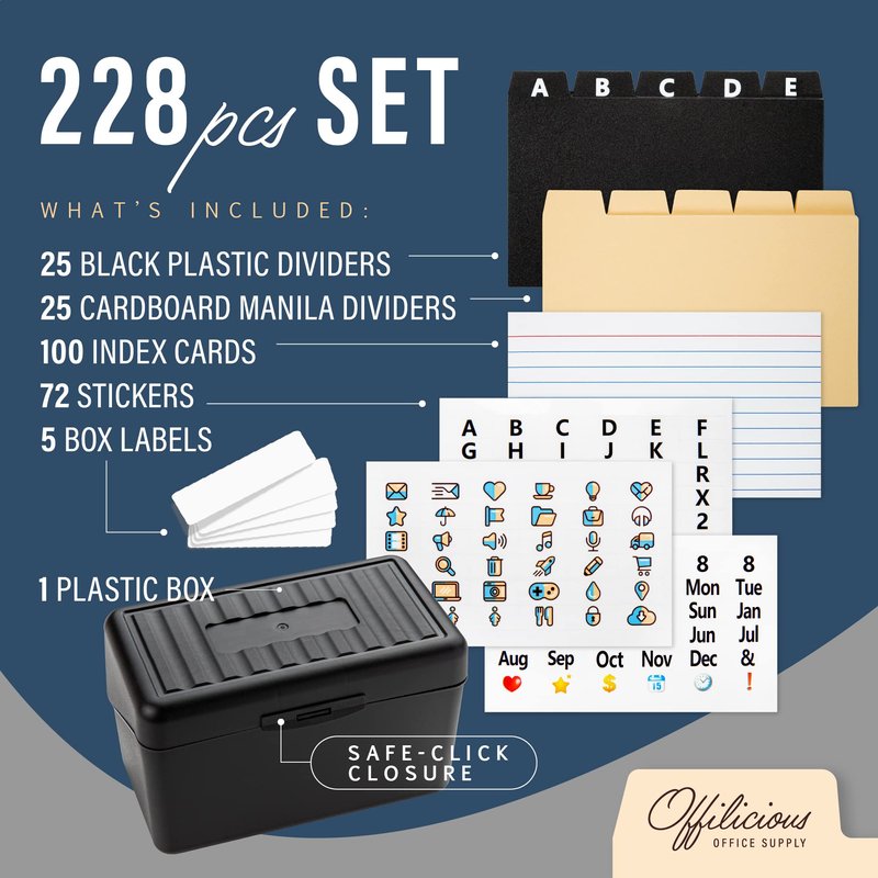 - INDEX CARD HOLDER SET INCLUDES – 4x6 INDEX CARD HOLDER BOX, 100 LINED INDEX CARDS 4x6, 25 manila INDEX CARD DIVIDERS, 25 BLACK PLASTIC CARD ALPHABET DIVIDERS, 5 box labels, and 72 STICKERS with the days of the week, months, numbers, letters & emojis.