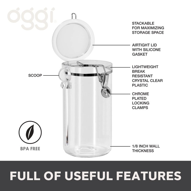 Oggi Clear Canister Airtight 72oz - Clamp Lid & Spoon - Airtight Food Storage Container, for Kitchen & Pantry Storage of Bulk, Dry Foods, Pasta, Flour, Sugar, Coffee, Rice, Tea, Spices & Herbs