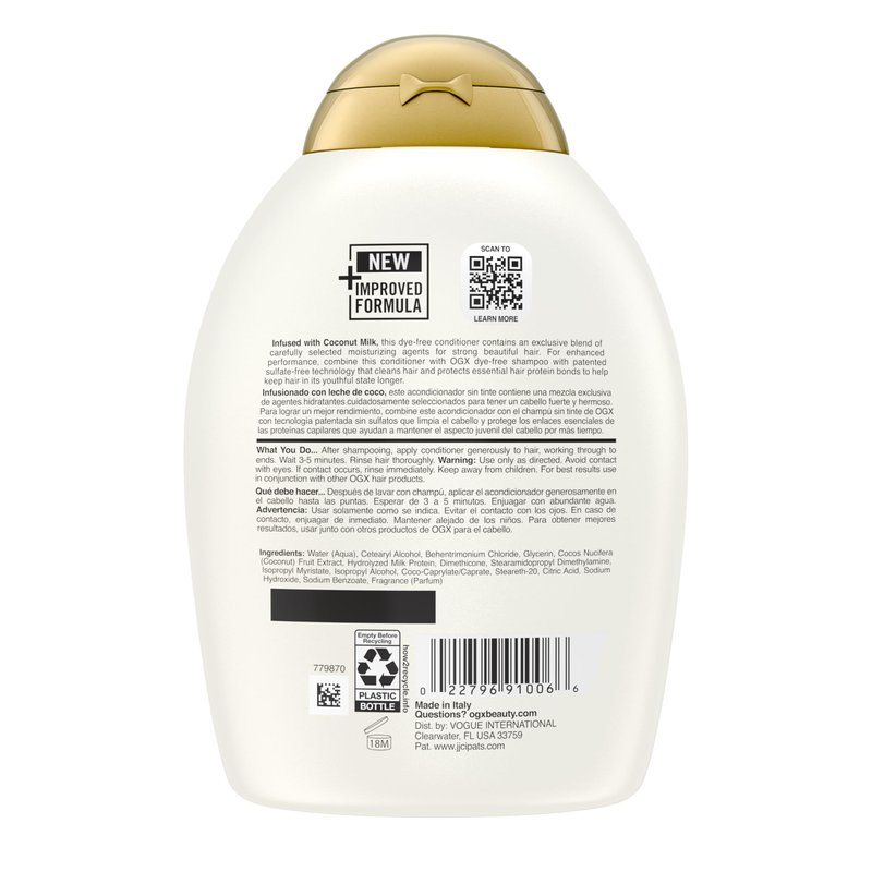 - HYDRATE & RESTORE: This 13-fluid ounce bottle of OGX Nourishing + Coconut Milk Conditioner with an intensely moisturizing formula immediately softens hair after the first use & helps strengthen & hydrate dry, damaged, & frizzy hair