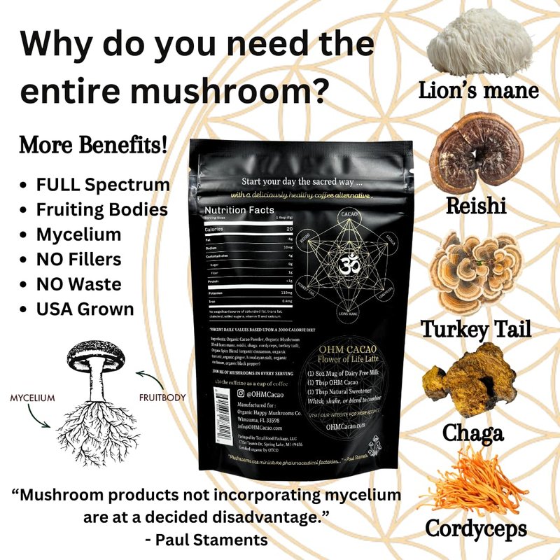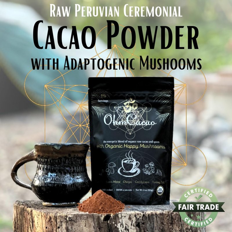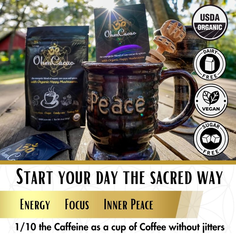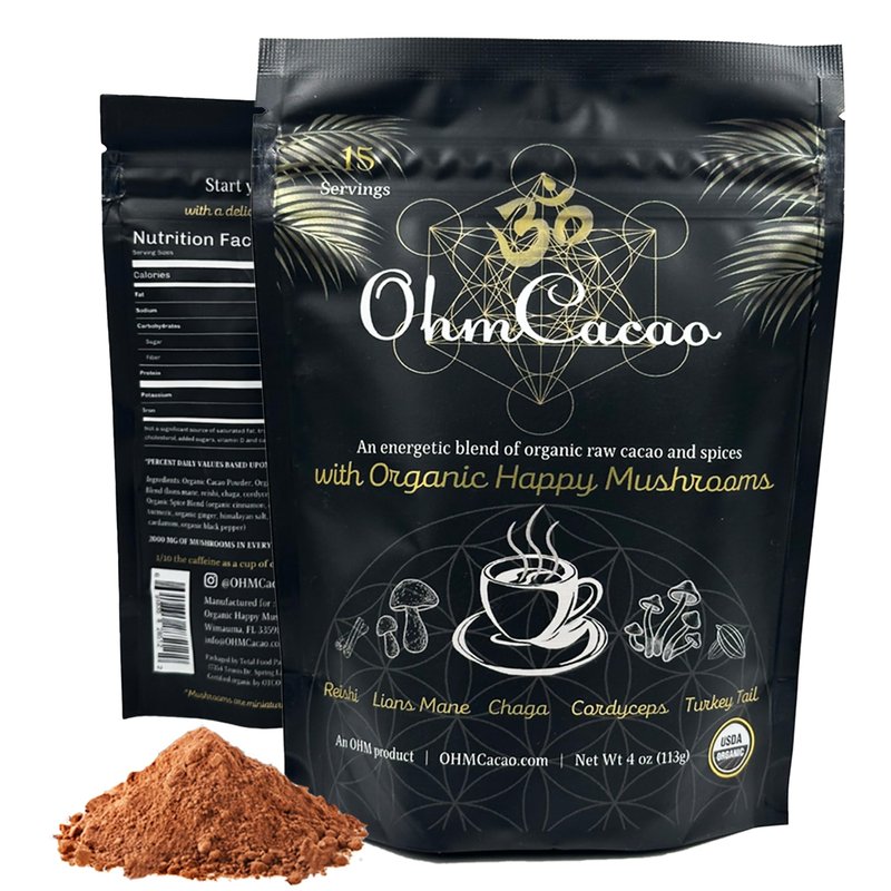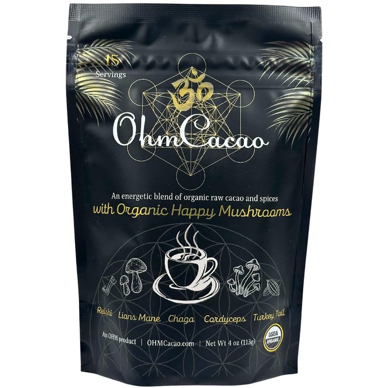 OHM Cacao is a deliciously healthy coffee alternative blend with 100% organic ingredients. The unique formula combines the bold richness of raw organic cold pressed cacao balanced with an light earthy flavor. The mushroom superfood blend will inspire you and the organic spice blend opens your senses and unlocks a new level of consciousness. The most dominant flavor and ingredient in OHM Cacao with a potent aroma and bold chocolatey flavor. Cacao was used for thousands of years by the ancient ancestors for spiritual rituals. It is said that cacao helps to opens up your heart chakra. Our raw cacao powder is sourced from 100% organic Peruvian cacao beans, cold-pressed, never roasted, to retain the delicious nutrition with only 1/10 the caffeine. You can taste the flavors of of life and feel the connection to the Earth. The blend of 5 different adaptagenic mushrooms was created to stimulate your brain and nourish your body. This premium blend of fungi has both the mycelium and fruiting bodies of the mushroom, grown in the PNW of the United States. We included lion's mane for focus, chaga and reishi for immunity, cordyceps for energy, and turkey tail for gut health. Our organic healthy spice mix (Cinnamon, Ginger, Turmeric, Cardamom, Black Pepper, Himalayan Salt) has many benefits for the body. Our mantra is to nourish the body, mind, and spirit. That's why we've created a delicious and nourishing coffee alternative made with 100% organic ingredients, including raw sacred organic cacao, adaptagenic mushrooms, and a proprietary blend of spices. By drinking OHM everyday, you can nourish your body with healthy and sustainable ingredients, support your mental clarity and focus, and connect with your inner self and the divine. We are committed to supporting you on your journey of transformation and well-being. OHM Cacao will provide your body and mind the energy it needs so you can live your best life!