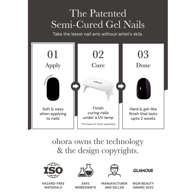 Worried about the color chipping off? Don’t be! Each gel nail is designed with three layers: the base gel, color gel, and top gel. The base gel is used to protect your nail beds. The color gel gives off that eye-catching design, while the top gel preserves the design of the polish. For the best results, we recommend curing your gel nails under ohora’s LED Gel Lamp (not included).