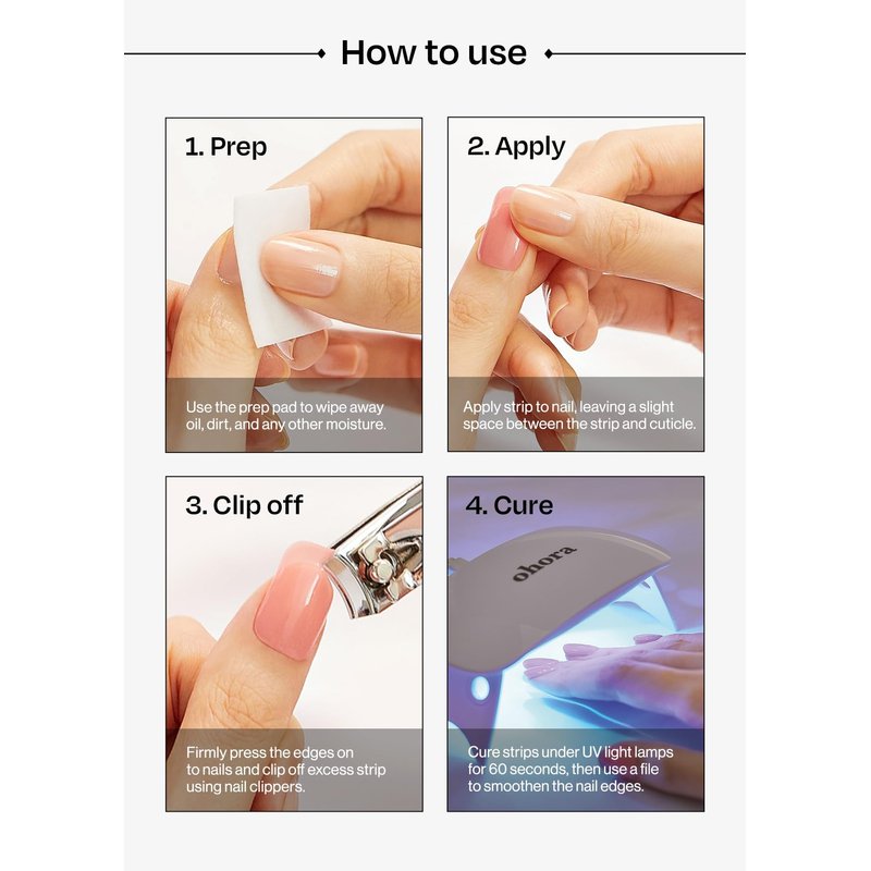 - Pro Tip for Beautiful Nails That Last 2 Weeks - After applying, cure the nail strips using ohora Gel Lamp for 2-3 times for best results and to minimize risk of chipping and pop offs.