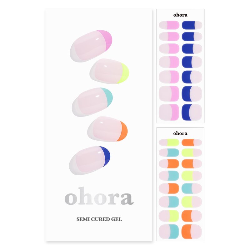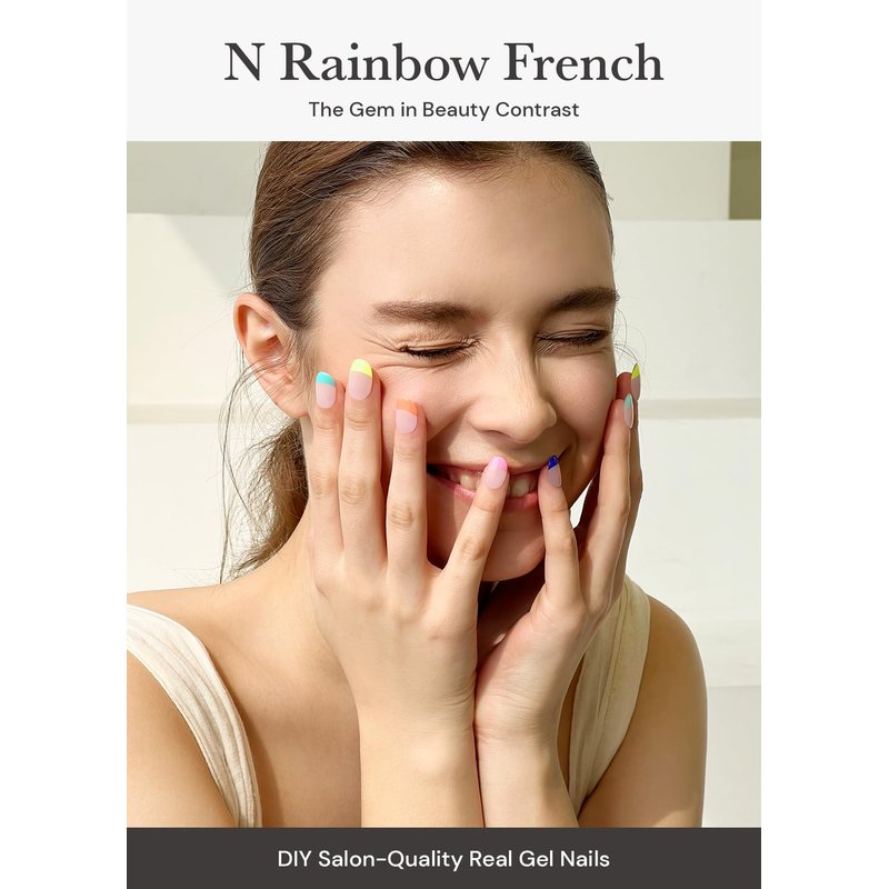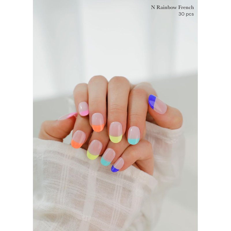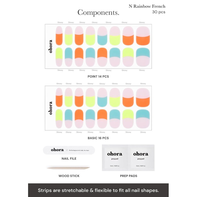 ohora Semi Cured Gel Nail Strips (N Rainbow French) - Extended Size Range, Works with Any Nail Lamps, Salon-Quality, Long Lasting, Easy to Apply&Remove - Includes 2Prep Pads, Nail File&Wooden Stick