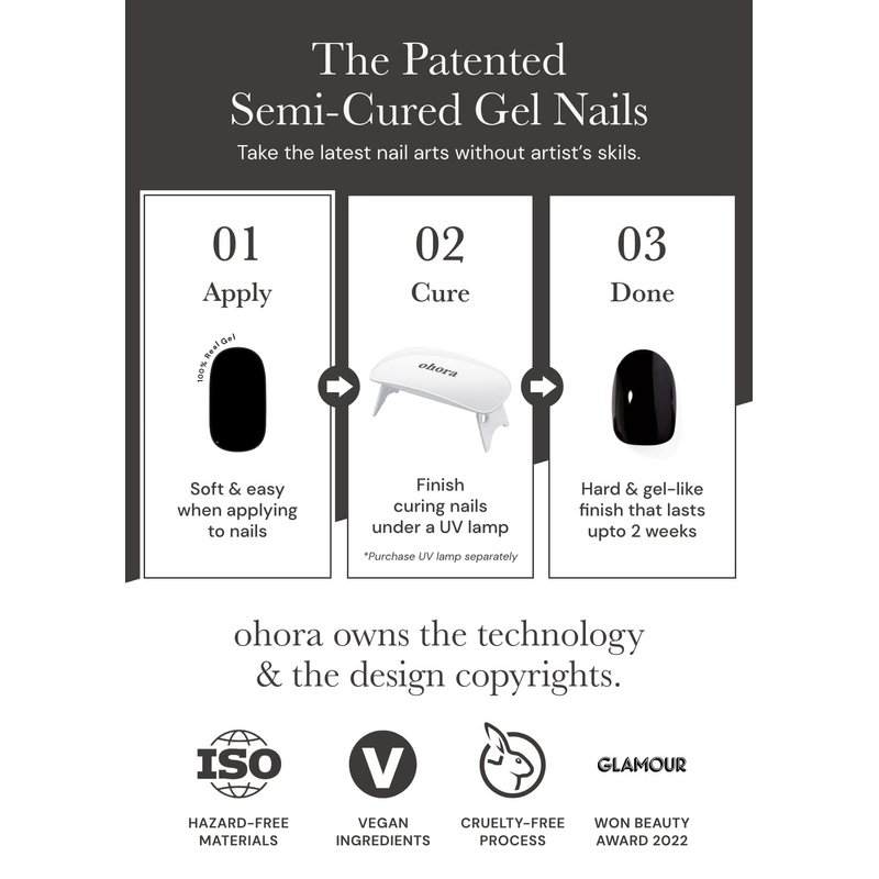 Worried about the color chipping off? Don’t be! Each gel pedi is designed with three layers: the base gel, color gel, and top gel. The base gel is used to protect your pedi beds. The color gel gives off that eye-catching design, while the top gel preserves the design of the polish. For the best results, we recommend curing your gel pedi under ohora’s LED Gel Lamp (not included).