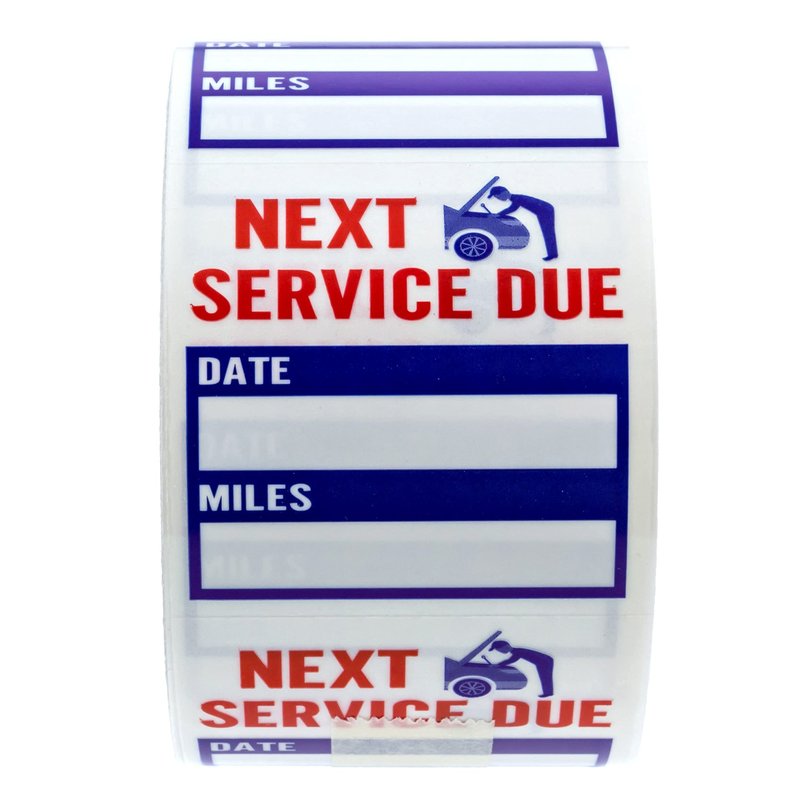 - Design: Bright red, clear, and blue mechanic Next Service Due" "Date" and "Miles" design. Printed on high quality clear window lite stock. Features a low tact adhesive that is repositionable and leaves no residue once removed.