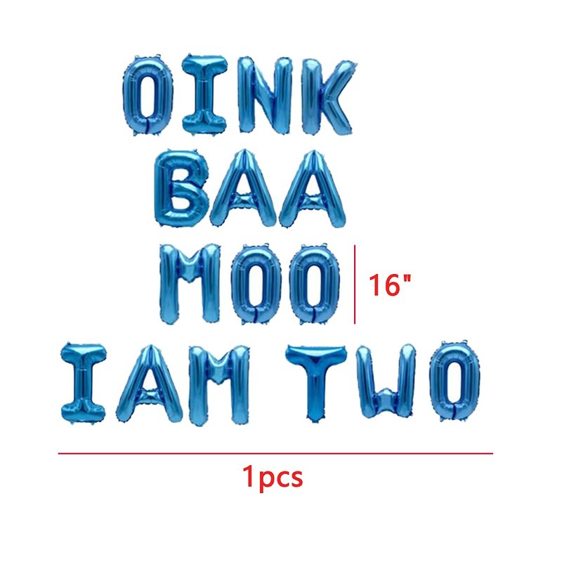 - You will get: 16 inch blue letter balloon: oink baa moo im two. 1pcs Animal Sheep aluminum film balloon, 1pcs animal bovine aluminum film balloon. (dimensions as shown)