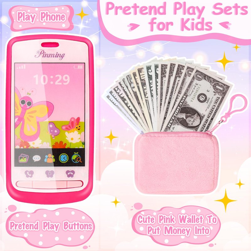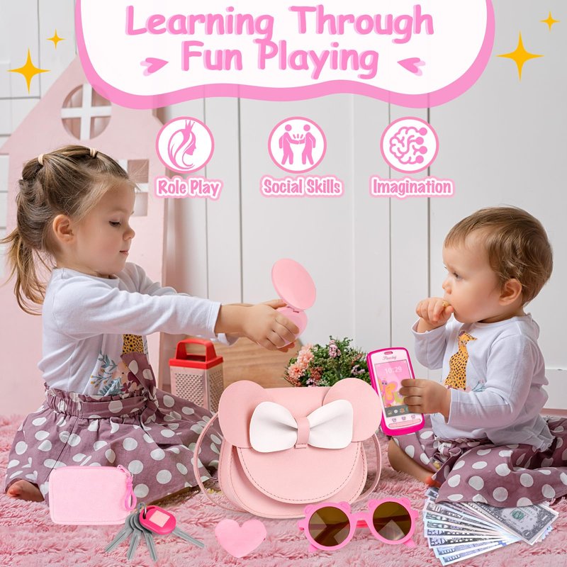 - 【Pretend To Shop Like Mom】All princess accessories look real. Imagine your little girl happily puts her play cell phone and play money in her crossbody purse bag, pretends to powder her face with powder, and puts on her sunglasses before she leaves the house, And she can go shopping like mom. Encourage your child to play pretend and use their imagination while improving cognitive skills. This purse toys are ideal for little girls ages 3 4 5 6+