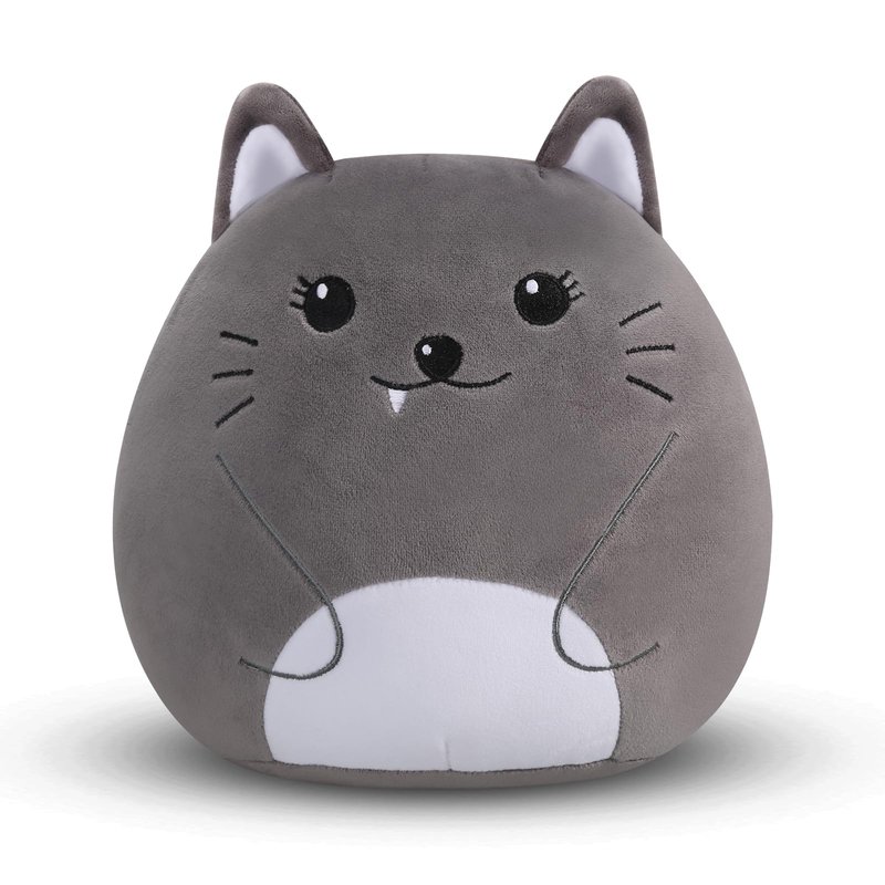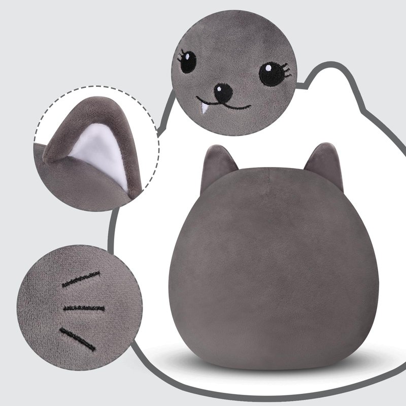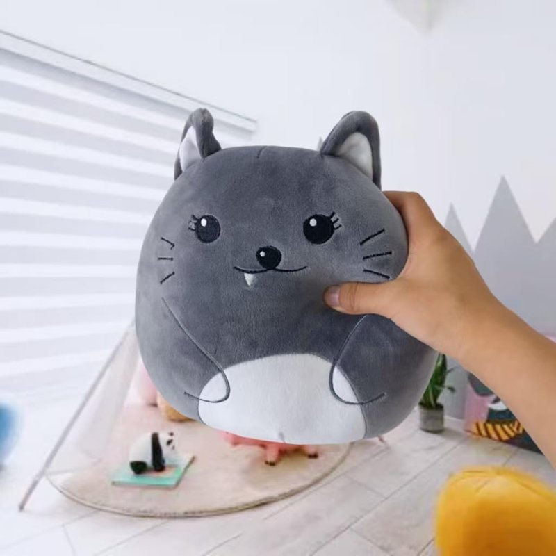- 1. Cute cat pillow: gray and soft fur, small pointed ears, small eyes, mischievous whiskers, a big mouth that can't help but laugh, finally revealing big white teeth, holding its white belly with both hands, as if declaring war on its might. If you love cats, you will definitely love this cute cat stuffed animal.