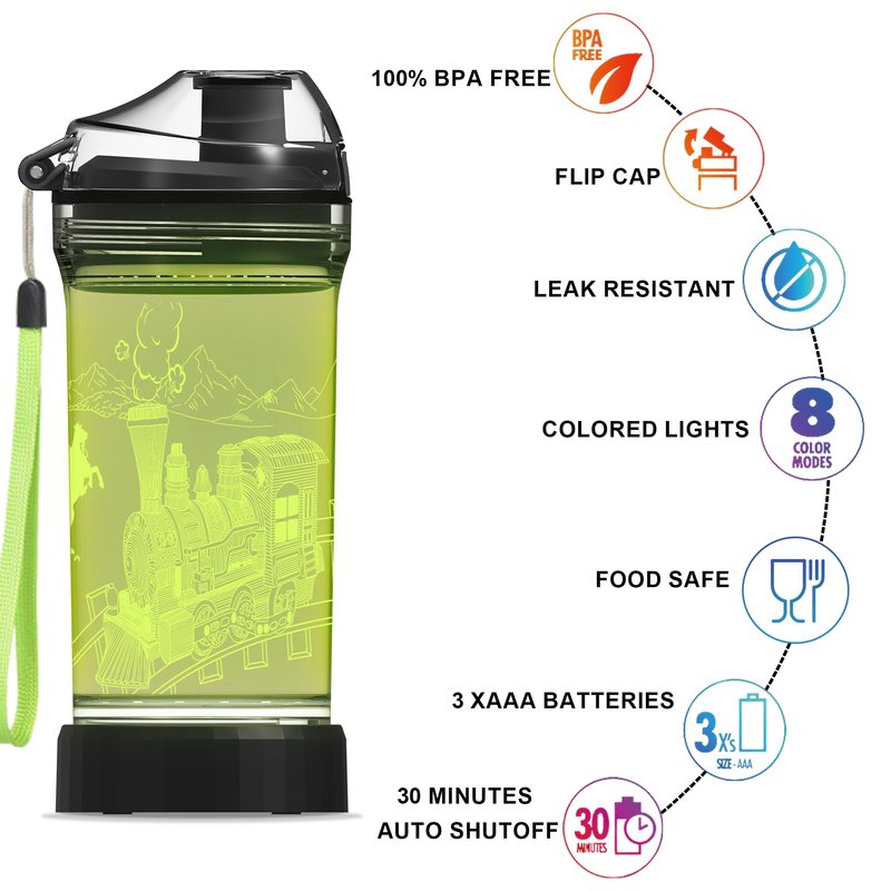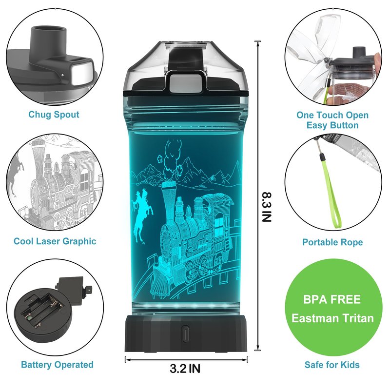 - 3D Illusion Lighting: Designed for active kids, our glow water bottle combines 3D laser engraving on its body with an LED light base, creating a captivating accessory. It's a compact yet powerful bottle, complete with a 30-minute auto shut-off timer to maximize battery life (requires AAA alkaline batteries, not included, lasting up to 40 hours).