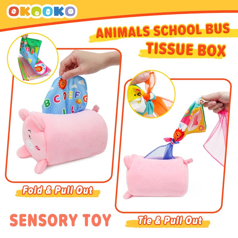 - PERFECT SENSORY TOY: OKOOKO baby tissue box is a montessori toy for baby in 6-12 months, this baby toy entertains baby with vibrant colors, various patterns, and pull-along fun. It is also a great activity toy in preschool learning and early education