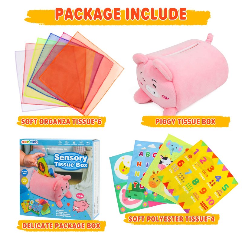- PIGGY TISSUE BOX: This tissue box is designed in a cute piggy style, the piggy body as a tissue box hiding tissues inside, waiting for little one to have pull-along fun! There are 4 polyester scarves with patterns, 6 organza scarves with different colors