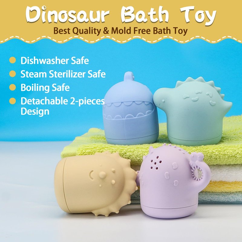 Olasmailo 4PCS Silicone Bath Toys for Toddlers 3-4 Years, Mold Free Bath Toys, Dinosaur Bath Toys, Organic Baby Toys, Squeeze Toys, Baby Beach Toys, Teething Toys, Chew Toys for Sucking Needs