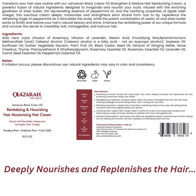 OLAZARAH Jamaican Black Castor Oil Revitalizing & Nourishing Hair Moisturizing Hair Cream, Infused with Shea Butter, Peppermint, and Apple Cider Vinegar, 10 Fl. oz