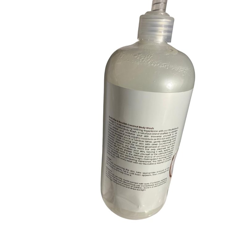 Indulge in a rejuvenating bathing experience with our Revitalize & Nourish Coconut Body Wash, a luxurious blend crafted to awaken your senses and revitalize your skin. Immerse yourself in the tropical essence of pure, organic coconuts as this rich and creamy formula envelops you in a luscious lather, gently cleansing away impurities while infusing your skin with deep nourishment and hydration. Enriched with the natural goodness of coconut oil and essential vitamins, our body wash not only cleanses but also replenishes and revitalizes your skin, leaving it soft, supple, and radiant after every shower.