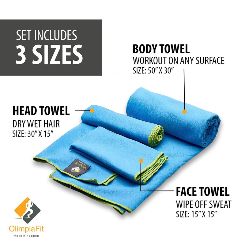 - MULTIPURPOSE - Each set includes 3 lightweight travel towels in the sizes 50"x30", 30"x15", and 15"x15". Use them as swim towels to dry off, gym towels during a workout, or small beach towels on vacation.
