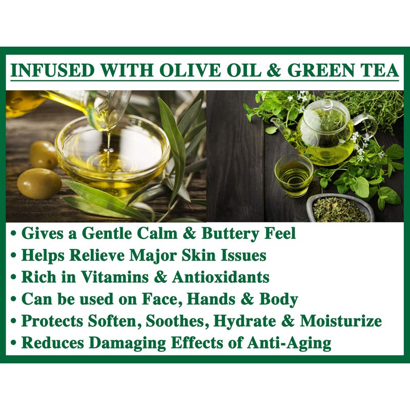 - ✅ INFUSED WITH OLIVE OIL & GREEN TEA: Olive oil is known to be a perfect skin Moisturizer and gives a very clean and buttery feel. It gives a very gentle and clean feel to skin and help in relieving Eczema and Psoriasis and Acne. Green Tea on the other hand is rich in antioxidants and helps in reducing Anti-aging properties, fine lines and sun damaged skin.