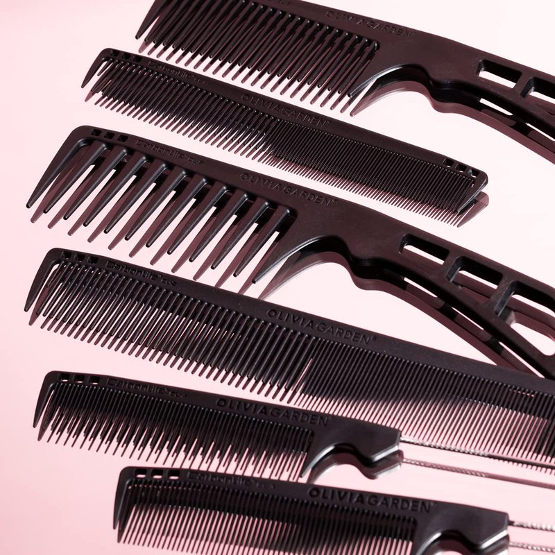 Carbon combs with a completely smooth body & seamless teeth design making them entirely snag-free when gliding through hair, unique patented design for optimal grip, balance & weight distribution with a wider top ridge to prevent slippage & dropping, anti-static, ultra-light, high heat resitant, chemical & stain-proof with ergonomic handle to avoid stress on wrist.