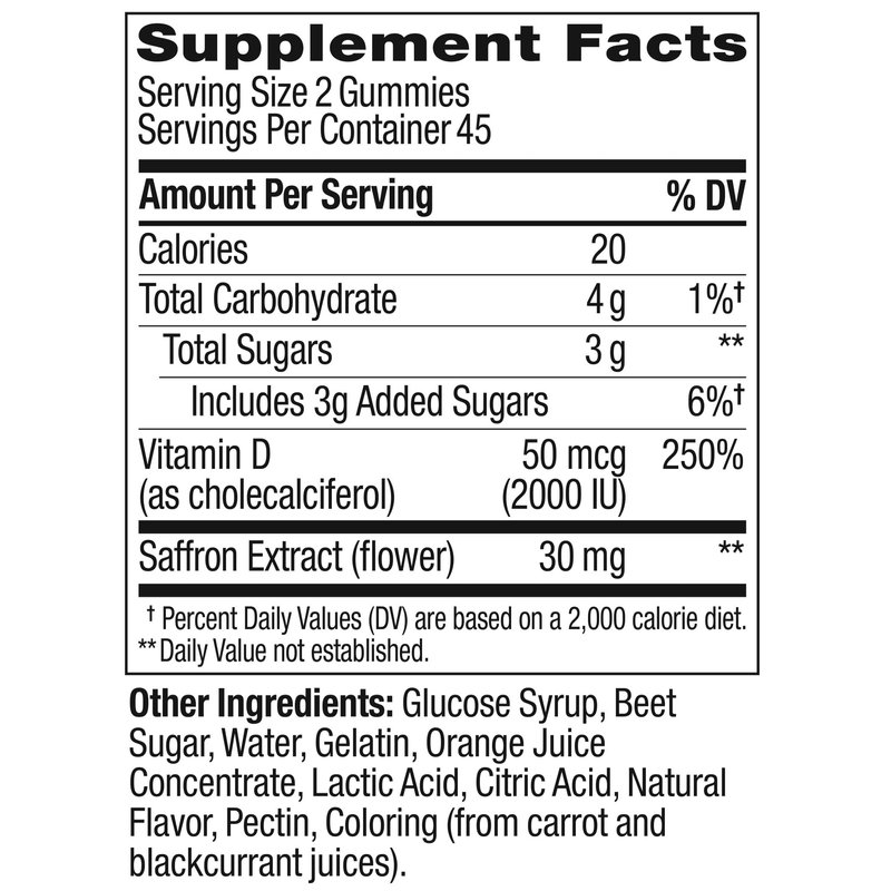 - THE GOODS INSIDE: Saffron helps boost serotonin for those feel-good vibes; It’s paired with Vitamin D, a happy mood’s bestie that goes straight to the source to support cellular and brain health, and provide antioxidant benefits