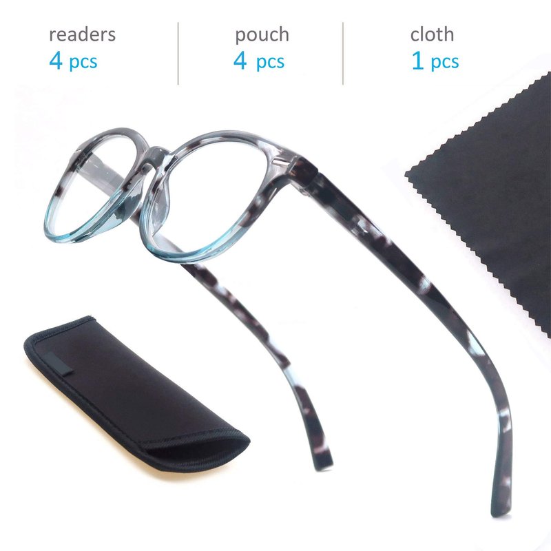 - [Package Details]-4 pairs of mix color reading glasses,4 glasses pouches,1 glasses cloth.