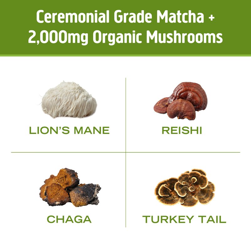 - Each serving of Om mushroom powered matcha Latte blend contains 2, 000mg of certified organic whole food mushroom powder with a full spectrum of nutrients.