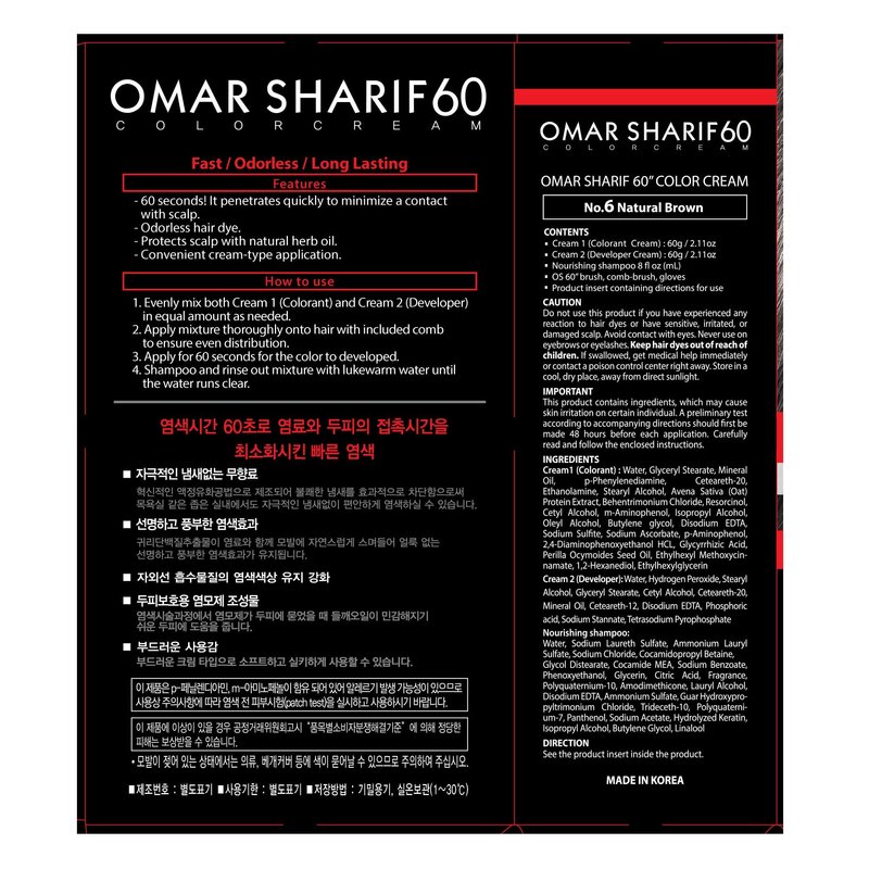 Omar Sharif 60sec Color Cream #6 Natural Brown To Use: Evenly mix Cream 1 and Cream 2 in an equal proportion before using and apply on the hair. Rinse with lukewarm water, one minute (60 seconds) after application and shampoo. Rinse enough with warm water after shampooing. Properly increase an application amount according to amount of indivudual's gray hairs. Contents: Cream 1 (Colorant Cream) 60/2.11oz Cream 2 (Developer Cream) 60g/2.11oz Ingredients: Cream 1 (Colorant Cream)- 20, Mineral Oil, Ethanolmine, Avena Sative(Oat), Kernel Extract, Stearyl Alcohol, p-Phenylenedia mine, Resorcinol, Behentrimonium Chloirde, Cetyl Alcoho, Sodium Sulfite, m-Aminophhenol, Disodium EDTA, Oleyl Alcohol, Glycyrrhiza Glabra (Lixoeixw) Root EXtract, Perilla Ocymoides Seed Oil, Ethy hexyl Methoxycinnamate, Thioglycolic Acid, p-Aminophenol, 4-Amino-2-Hydroxytoluene. Cream 2 (Developer Cream): Water, Hydrogen Peroxide, Ceteareth-20, Cetyl Alcohol, Stearyl Alcohol, Mineral Oil, Phosphoric Acid, Sodium Stannate, Tetrasodium Pyrophosphate.