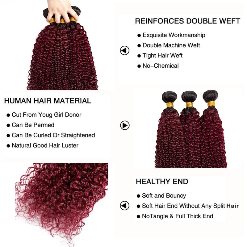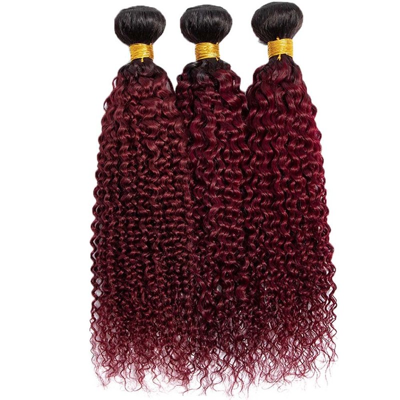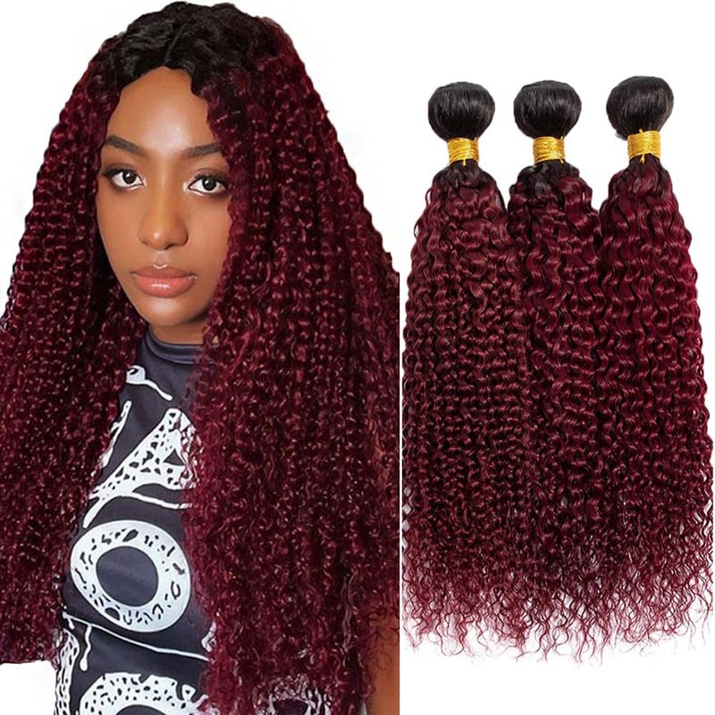 - Hair Color:1B99J Two Tone Black And Burgundy Ombre Kinky Curly Hair Bundles